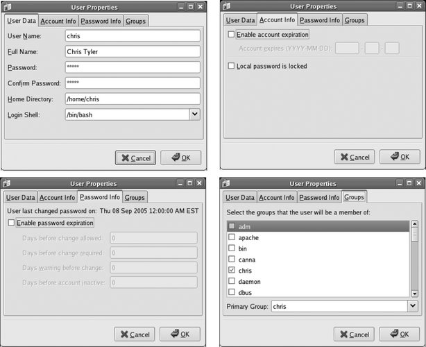 Once you have filled in all of these fields, click OK. You will be returned to the main User and Group configuration window (Figure 4-8). To edit a user, double-click on the user's name, or highlight the name and click the Properties icon. An edit window will appear with four tabs, enabling you to edit values that cannot be set during the creation of the account; Figure 4-10 shows each of these tabs. Figure 4-10. The four tabs of the User Properties window