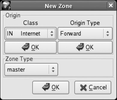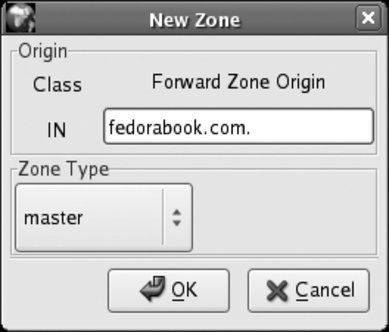 Click OK under Class, and then click OK under Origin Type. The dialog's controls will change to let you type in the Forward Zone Origin, as shown in Figure 7-8. Enter the name of the domain with a period at the endfor example, fedorabook.com. Figure 7-8. Zone Origin entry