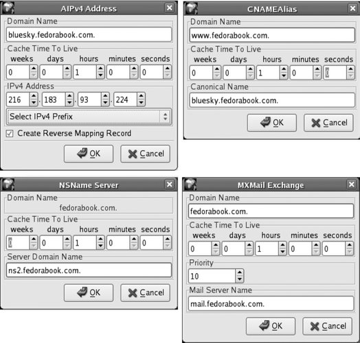The remaining zone sections are used to resolve standard requests, such as the address of localhost and localhost.localdomain (always 127.0.0.1), and the reverse of those requests. To create a new zone, add it to the end of this file (you can copy an existing zone entry and then modify it): zone "fedorabook.com" IN {