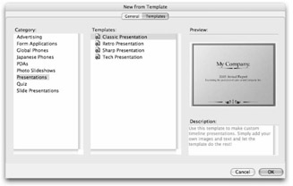 The library of predefined Flash documents available in the Templates tab of the New Document dialog box (or in the Create from Template list of the Start Page) is a great starting point for creating many common Flash presentations. The templates shown in Figure 4-18 are listed in both Flash Basic and Flash Professional, but some of the templates can only be used in the pro version of the program.
