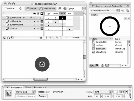 To demonstrate building an animated Flash movie from various symbol types, we made a Button symbol called basicButton that uses some raw shapes, some Graphic symbols, and some Movie Clips, all nested inside a Button symbol timeline.