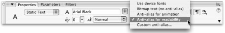The Anti-alias for readability setting does an amazing job of rendering smooth, legible type, even at small sizes. This setting has only two drawbacks: It contributes to larger file sizes and it can only be rendered with Flash Player 8. The Anti-alias for animation setting smoothes text almost as well as the Anti-alias for readability setting but it ignores kerning information in order to create slightly smaller files and to render animated text more quickly. This is the only anti-aliasing option that will render on older versions of the Flash Player.