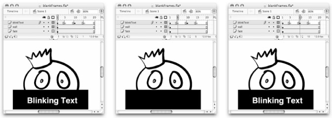 To illustrate how blank frames play back in an animation, we've created a silly example with a face and a rectangle that persist in every frame and some text that only exists on some frames (see Figure 11-3).