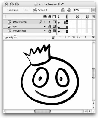 Figure 11-8 shows an animated "smile" created by interpolating the graphics between a dot and a curved stroke with a Shape tween. Flash nimbly handles this simple transition, rendering a gradually extending line on the frames between the dot of the pursed mouth and the final curve of the smile.