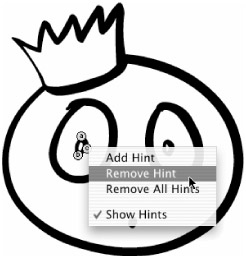 To remove an individual Hint, drag it off the Stage with the Selection tool. To remove all Hints from an active keyframe, choose Modify ð Shape ð Remove All Hints from the application menu. A shortcut is to right-click (Control+click on Mac) any of the Hints to invoke the contextual menu, as shown in Figure 11-16, for these and other options as you are working.