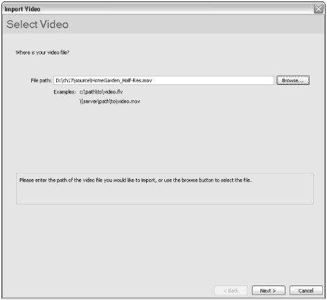When you first select the Import Video option from the File ð Import menu in Flash Basic 8, you see the Select Video screen of the Import Video dialog box, as shown in Figure 17-1. On the Select Video screen, you can browse to a video source clip. To proceed to the next stage of import, click the Next button.