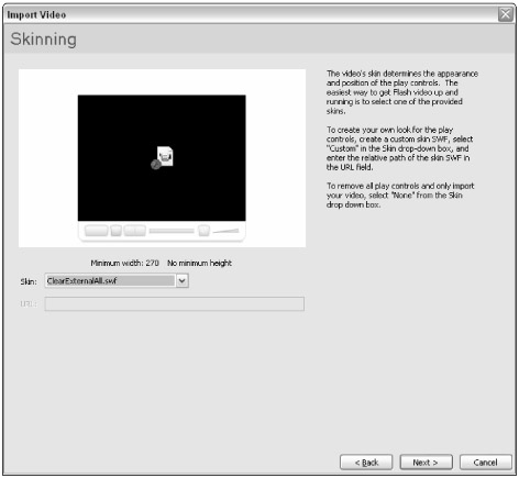 If you select an existing .flv file, the Video Import wizard jumps straight into the Skinning screen, as we described in the last section. |
