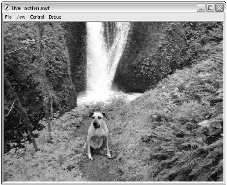 Save the Flash document, and test it (Ctrl+Enter or z+Enter). The footage of Stella should be superimposed between the graphic of the branch and the forest background, as shown in Figure 17-44.