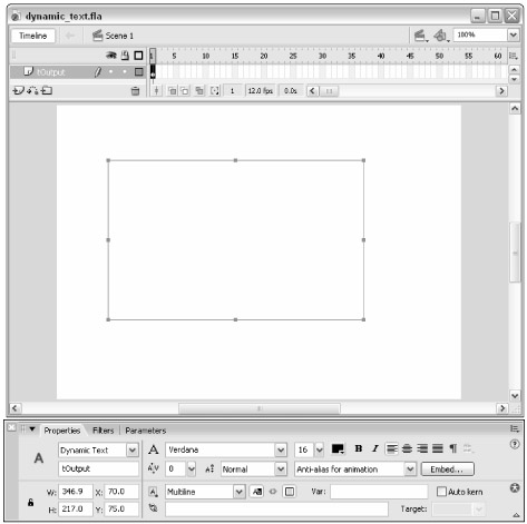 In the Property inspector, select Dynamic Text in the top-left menu. Select Multiline from the Line type menu. In the <Instance Name> field, enter the text tOutput. Click the Selectable and Show Border options. Refer to Figure 29-2 for these settings.