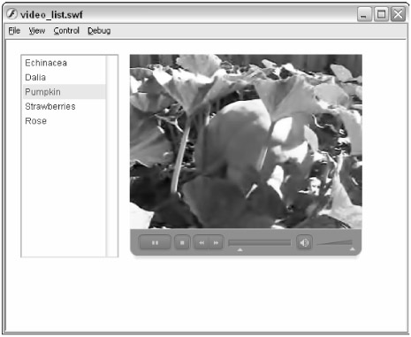 Save the Flash document, and test it (Ctrl+Enter or z+Enter). After the XML data loads into the XMLConnector component and displays in the List component, click one of the video clip names in the List component. The .flv file associated with that video clip should then play in the FLVPlayback component, as shown in Figure 34-11.