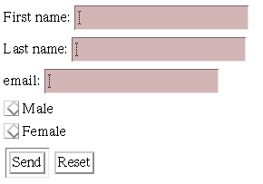 <FORM action="http://somesite.com/prog/adduser" method="post"> <P> First name: <INPUT type="text" name="firstname"><BR> Last name: <INPUT type="text" name="lastname"><BR> email: <INPUT type="text" name="email"><BR> <INPUT type="radio" name="sex" value="Male"> Male<BR> <INPUT type="radio" name="sex" value="Female"> Female<BR> <INPUT type="submit" value="Send"> <INPUT type="reset"> </FORM>Õâ ¸ö ±í µ¥ »á ±» Èç Ï äÖ È¾:
