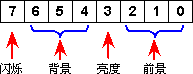 在显示字符时,用一个字节存储该字符的ASCII码,用另一个字节存储的显示属性,即:显示颜色。彩色显示器的字符显示属性定义如图8.6所示,有关颜色值的定义,请参阅附录6中的表4。