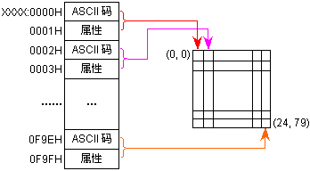 在常用的文本显示模式(模式3)下,屏幕被划分成25行,每行可显示80个字符,所以,每屏最多可显示2000(80×25)个字符。为了便于标识屏幕上的每个显示位置,我们就用其所在行和列来表示之,并规定:屏幕的左上角坐标为(0, 0),右下角坐标为(24, 79)。