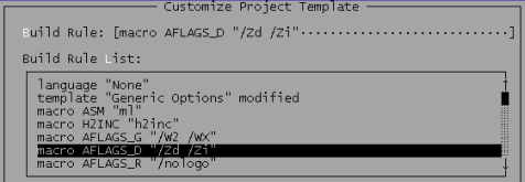 在该画面的Build Rule List列表框中选择macro AFLAGS_D “”,并把它修改为macro AFLAGS_D “/Zi /Zd”。
