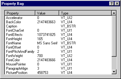 Property bags enable the container to choose the persistence format. Unlike IStream and IStorage, IPropertyBag has no predefined implementation. The container can choose any format that it can parse to retrieve the CLSID of the object and its name/value pairs representing the properties. Visual Basic form files (.frm) and controls hosted in Web pages are two examples of the use of property bag persistence to save properties as text. A Visual Basic form with a single button on it has this format when persisted: