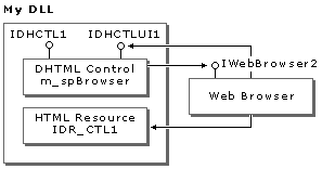 The following graphic illustrates the relationship between your DLL, the DHTML control, the web browser, and the HTML resource.