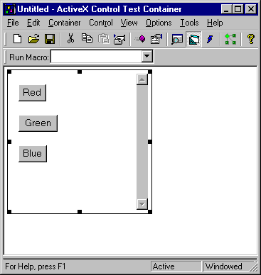 The ATL Object Wizard generates a control with default code in both the HTML resource and the .cpp file. You can compile and run the control as it is generated by the wizard, and then view the control in either the web browser or Test Container. The picture below shows the default ATL DHTML control with three buttons displayed in Test Container: