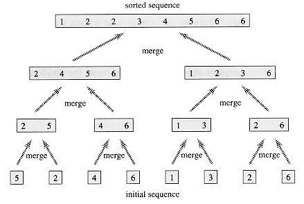 . The lengths of the sorted sequences being merged increase as the algorithm progresses from bottom to top.