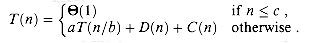 (1). Suppose we divide the problem into a subproblems, each of which is 1/b the size of the original. If we take D(n) time to divide the problem into subproblems and C(n) time to combine the solutions to the subproblems into the solution to the original problem, we get the recurrence