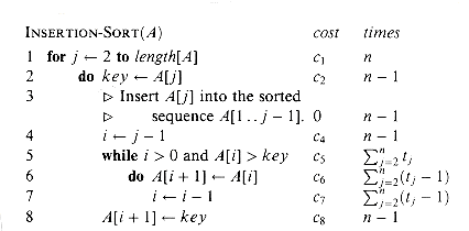 We start by presenting the INSERTION-SORT procedure with the time "cost" of each statement and the number of times each statement is executed. For each j = 2, 3, . . . , n, where n = length[A], we let tj be the number of times the while loop test in line 5 is executed for that value of j. We assume that comments are not executable statements, and so they take no time.