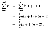 evaluates to 1/2n(n + 1). We can easily verify this for n = 1, so we make the inductive assumption that it holds for n and prove that it holds for n + 1. We have