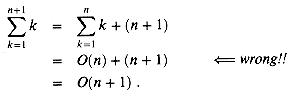 We have to be careful when we use asymptotic notation to prove bounds by induction. Consider the following fallacious proof that