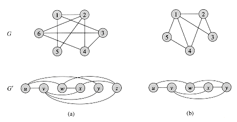 E'. In other words, we can relabel the vertices of G to be vertices of G', maintaining the corresponding edges in G and G'. Figure 5.3(a) shows a pair of isomorphic graphs G and G' with respective vertex sets V = {1, 2, 3, 4, 5, 6} and V' = {u, v, w, x, y, z}. The mapping from V to V' given by f(1) = u, f(2) = v, f(3) = w, f(4) = x, f(5) = y, f(6) = z is the required bijective function. The graphs in Figure 5.3(b) are not isomorphic. Although both graphs have 5 vertices and 7 edges, the top graph has a vertex of degree 4 and the bottom graph does not.