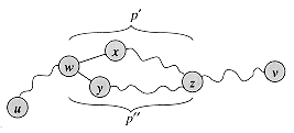 Figure 5.5 A step in the proof of Theorem 5.2: if (1) G is a free tree, then (2) any two vertices in G are connected by a unique simple path. Assume for the sake of contradiction that vertices u and v are connected by two distinct simple paths p1 and p2. These paths first diverge at vertex w, and they first reconverge at vertex z. The path p' concatenated with the reverse of the path p\" forms a cycle, which yields the contradiction.