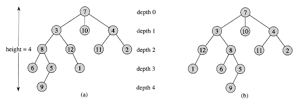 Figure 5.6 Rooted and ordered trees. (a) A rooted tree with height 4. The tree is drawn in a standard way: the root (node 7) is at the top, its children (nodes with depth 1 ) are beneath it, their children (nodes with depth 2) are beneath them, and so forth. If the tree is ordered, the relative left-to-right order of the children of a node matters; otherwise it doesn't. (b) Another rooted tree. As a rooted tree, it is identical to the tree in (a), but as an ordered tree it is different, since the children of node 3 appear in a different order.