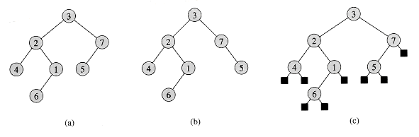 Figure 5.7 Binary trees. (a) A binary tree drawn in a standard way. The left child of a node is drawn beneath the node and to the left. The right child is drawn beneath and to the right. (b) A binary tree different from the one in (a). In (a), the left child of node 7 is 5 and the right child is absent. In (b), the left child of node 7 is absent and the right child is 5. As ordered trees, these trees are the same, but as binary trees, they are distinct. (c) The binary tree in (a) represented by the internal nodes of a full binary tree: an ordered tree in which each internal node has degree 2. The leaves in the tree are shown as squares.