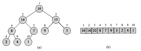 Figure 7.1 A heap viewed as (a) a binary tree and (b) an array. The number within the circle at each node in the tree is the value stored at that node. The number next to a node is the corresponding index in the array.