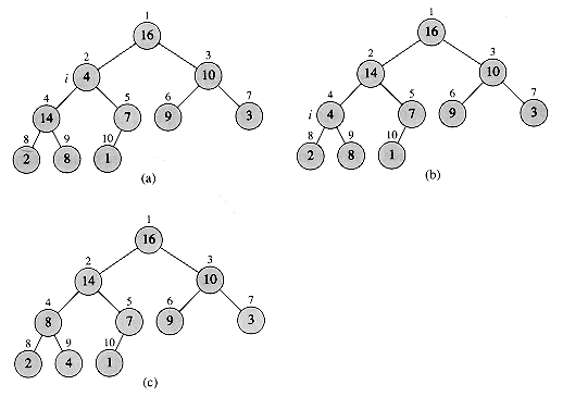 Figure 7.2 The action of HEAPIFY(A, 2), where heap-size[A] = 10. (a) The initial configuration of the heap, with A[2] at node i = 2 violating the heap property since it is not larger than both children. The heap property is restored for node 2 in (b) by exchanging A[2] with A[4], which destroys the heap property for node 4. The recursive call HEAPIFY(A, 4) now sets i = 4. After swapping A[4] with A[9], as shown in (c), node 4 is fixed up, and the recursive call HEAPIFY(A, 9) yields no further change to the data structure.