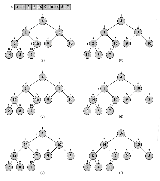 Figure 7.3 The operation of BUILD-HEAP, showing the data structure before the call to HEAPIFY in line 3 of BUILD-HEAP. (a) A 10-element input array A and the binary tree it represents. The figure shows that the loop index i points to node 5 before the call HEAPIFY(A, i). (b) The data structure that results. The loop index i for the next iteration points to node 4. (c)-(e) Subsequent iterations of the for loop in BUILD-HEAP. Observe that whenever HEAPIFY is called on a node, the two subtrees of that node are both heaps. (f) The heap after BUILD-HEAP finishes.