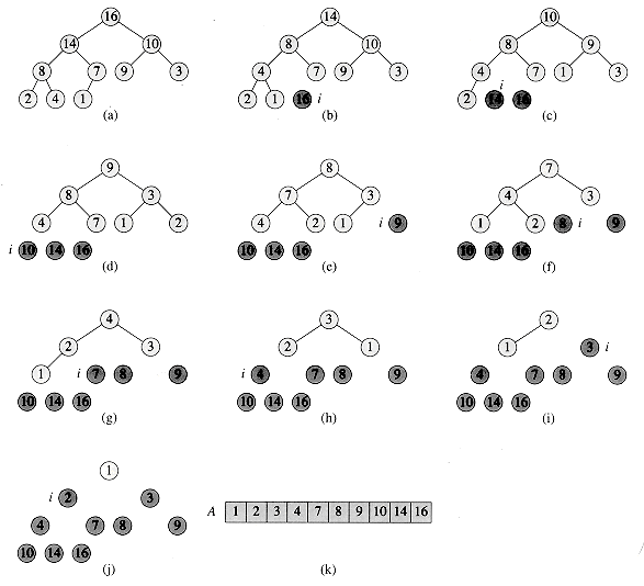Figure 7.4 The operation of HEAPSORT. (a) The heap data structure just after it has been built by BUILD-HEAP. (b)-(j) The heap just after each call of HEAPIFY in line 5. The value of i at that time is shown. Only lightly shaded nodes remain in the heap. (k) The resulting sorted array A.