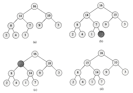 Figure 7.5 The operation of HEAP-INSERT. (a) The heap of Figure 7.4(a) before we insert a node with key 15. (b) A new leaf is added to the tree. (c) Values on the path from the new leaf to the root are copied down until a place for the key 15 is found. (d) The key 15 is inserted.