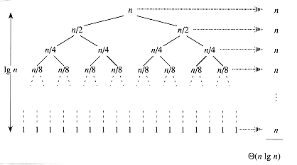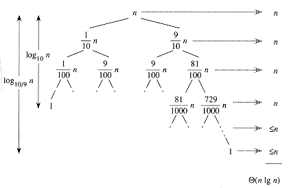 Suppose, for example, that the partitioning algorithm always produces a 9-to-1 proportional split, which at first blush seems quite unbalanced. We then obtain the recurrence