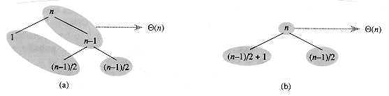 Figure 8.5 (a) Two levels of a recursion tree for quicksort. The partitioning at the root costs n and produces a "bad" split: two subarrays of sizes 1 and n - 1. The partitioning of the subarray of size n - 1 costs n - 1 and produces a "good" split: two subarrays of size (n - 1)/2. (b) A single level of a recursion tree that is worse than the combined levels in (a), yet very well balanced.