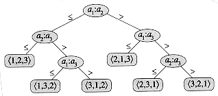 Figure 9.1 The decision tree for insertion sort operating on three elements. There are 3! = 6 possible permutations of the input elements, so the decision tree must have at least 6 leaves.