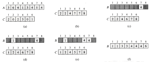 Figure 9.2 The operation of COUNTING-SORT on an input array A[1 . . 8], where each element ofA is a positive integer no larger than k = 6. (a) The array A and the auxiliary array C after line 4. (b) The array C after line 7. (c)-(e) The output array B and the auxiliary array C after one, two, and three iterations of the loop in lines 9-11, respectively. Only the lightly shaded elements of array B have been filled in. (f) The final sorted output array B.