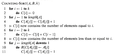 In the code for counting sort, we assume that the input is an array A[1 . . n], and thus length[A] = n. We require two other arrays: the array B[1 . . n] holds the sorted output, and the array C[1 . . k] provides temporary working storage.