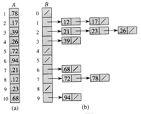 Figure 9.4 The operation of BUCKET-SORT. (a) The input array A[1 . .10]. (b) The array B[0 . . 9] of sorted lists (buckets) after line 5 of the algorithm. Bucket i holds values in the interval [i/10,(i + 1)/10). The sorted output consists of a concatenation in order of the lists B[0], B[1], . . . , B[9].