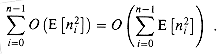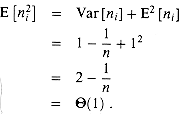 In order to evaluate this summation, we must determine the distribution of each random variable ni. We have n elements and n buckets. The probability that a given element falls into bucket B[i] is 1/n, since each bucket is responsible for 1/n of the interval [0,1). Thus, the situation is analogous to the ball-tossing example of Section 6.6.2: we have n balls (elements) and n bins (buckets), and each ball is thrown independently with probability p = 1 /n of falling into any particular bucket. Thus, the probability that ni = k follows the binomial distribution b(k; n, p), which has mean E[ni] = np = 1 and variance Var[ni] = np(1 - p) = 1- 1/n. For any random variable X, equation (6.30) gives