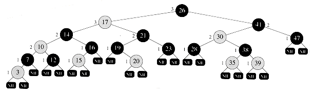 Figure 14.1 A red-black tree with black nodes darkened and red nodes shaded. Every node in a red-black tree is either red or black, every leaf (NIL) is black, the children of a red node are both black, and every simple path from a node to a descendant leaf contains the same number of black nodes. Each non-NIL node is marked with its black-height; NIL'S have black-height 0.