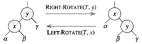 Figure 14.2 The rotation operations on a binary search tree. The operation RIGHT-ROTATE(T,x) transforms the configuration of the two nodes on the left into the configuration on the right by changing a constant number of pointers. The configuration on the right can be transformed into the configuration on the left by the inverse operation LEFT-ROTATE(T,y). The two nodes might occur anywhere in a binary search tree. The letters