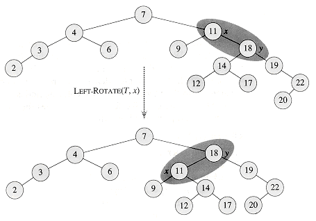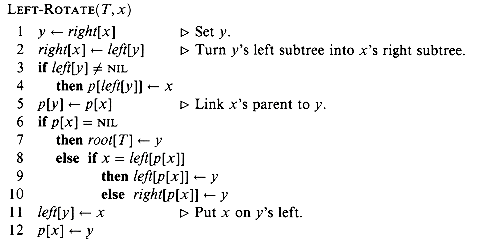 Figure 14.3 shows how LEFT-ROTATE operates. The code for RIGHT-ROTATE is similar. Both LEFT-ROTATE and RIGHT-ROTATE run in O(l) time. Only pointers are changed by a rotation; all other fields in a node remain the same.