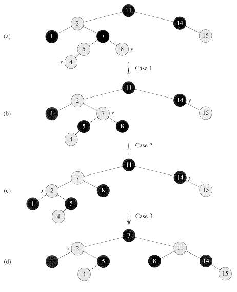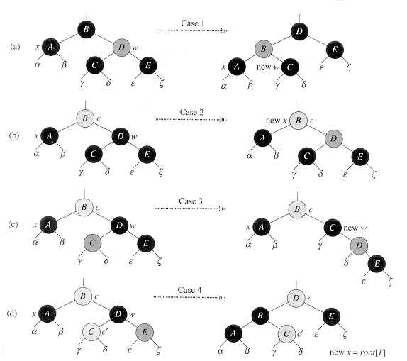 Figure 14.7 The cases in the while loop of the procedure RB-DELETE. Darkened nodes are black, heavily shaded nodes are red, and lightly shaded nodes, which may be either red or black, are represented by c and c'. The letters