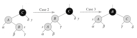 has a black root, and each has the same black-height. Case 2 is transformed into case 3 by a left rotation, which preserves property 4: all downward paths from a node to a leaf have the same number of blacks. Case 3 causes some color changes and a right rotation, which also preserve property 4. The while loop then terminates, because property 3 is satisfied: there are no longer two red nodes in a row.