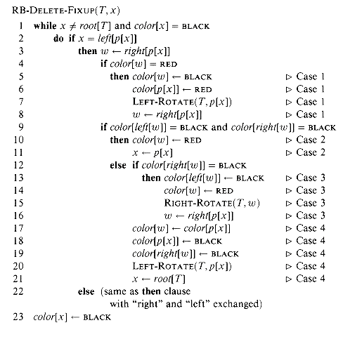 has a black root, and each has the same black-height. The code for case 1 changes the colors of some nodes, preserving property 4: all downward paths from a node to a leaf have the same number of blacks. The while loop continues with node x's grandparent p[p[x]] as the new x. Any violation of property 3 can now occur only between the new x, which is red, and its parent, if it is red as well.