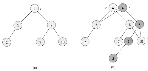 Figure 14.8 (a) A binary search tree with keys 2, 3, 4, 7, 8, 10. (b) The persistent binary search tree that results from the insertion of key 5. The most recent version of the set consists of the nodes reachable from the root r', and the previous version consists of the nodes reachable from r. Heavily shaded nodes are added when key 5 is inserted.