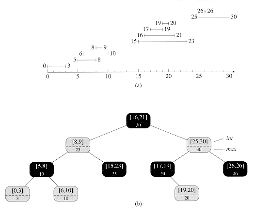 Figure 15.4 An interval tree. (a) A set of 10 intervals, shown sorted bottom to top by left endpoint. (b) The interval tree that represents them. An inorder tree walk of the tree lists the nodes in sorted order by left endpoint.